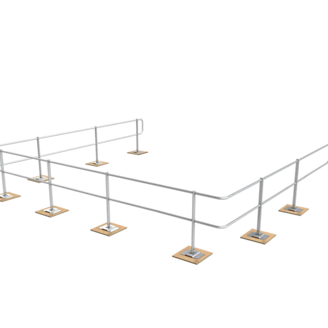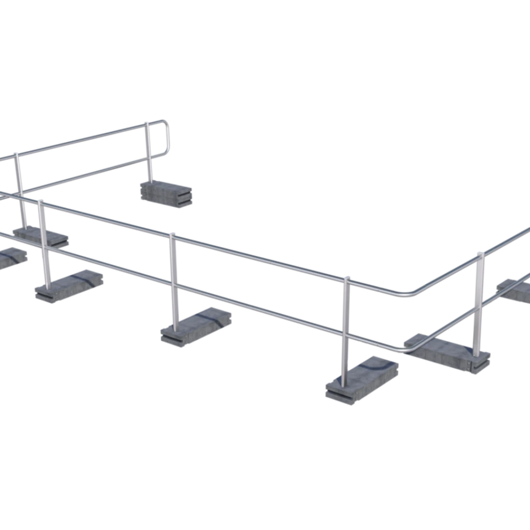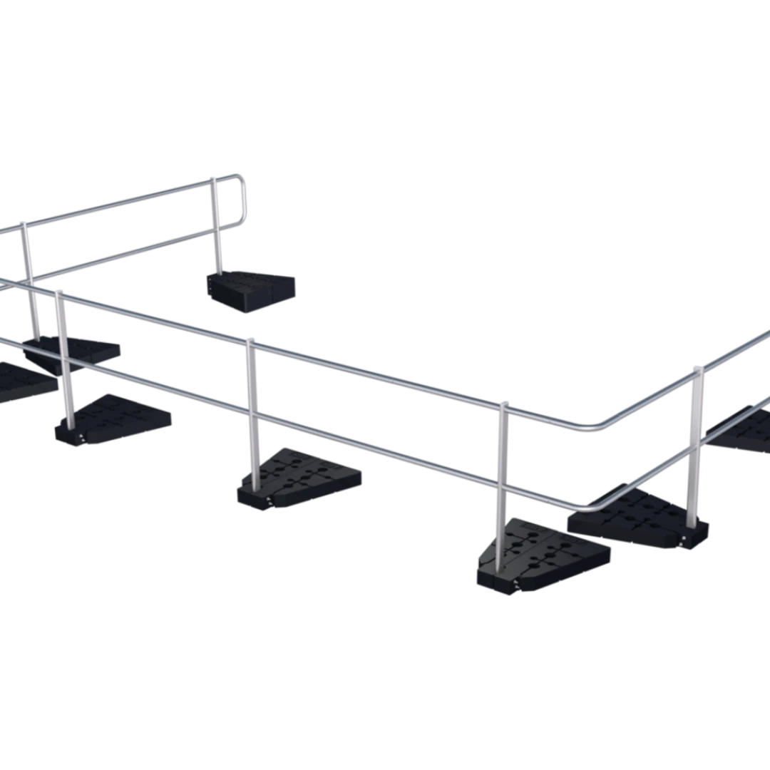 Dieses Geländersystem eignet sich zur kollektiven Flachdachsicherung bei Neigungen bis 10°. Es ist flexibel einsetzbar, witterungsbeständig und lässt sich einfach montieren. Damit können Dachkanten, Lichtkuppeln und andere absturzgefährdete Bereiche gesichert werden – ohne Dachdurchdringung. Der Seitenschutz ist 1.100 mm hoch und kann gerade oder um 15° geneigt aufgestellt werden. Optional ist eine Einbindung in Blitzschutzanlagen (100 kA) nach DIN EN 62305-3 möglich.