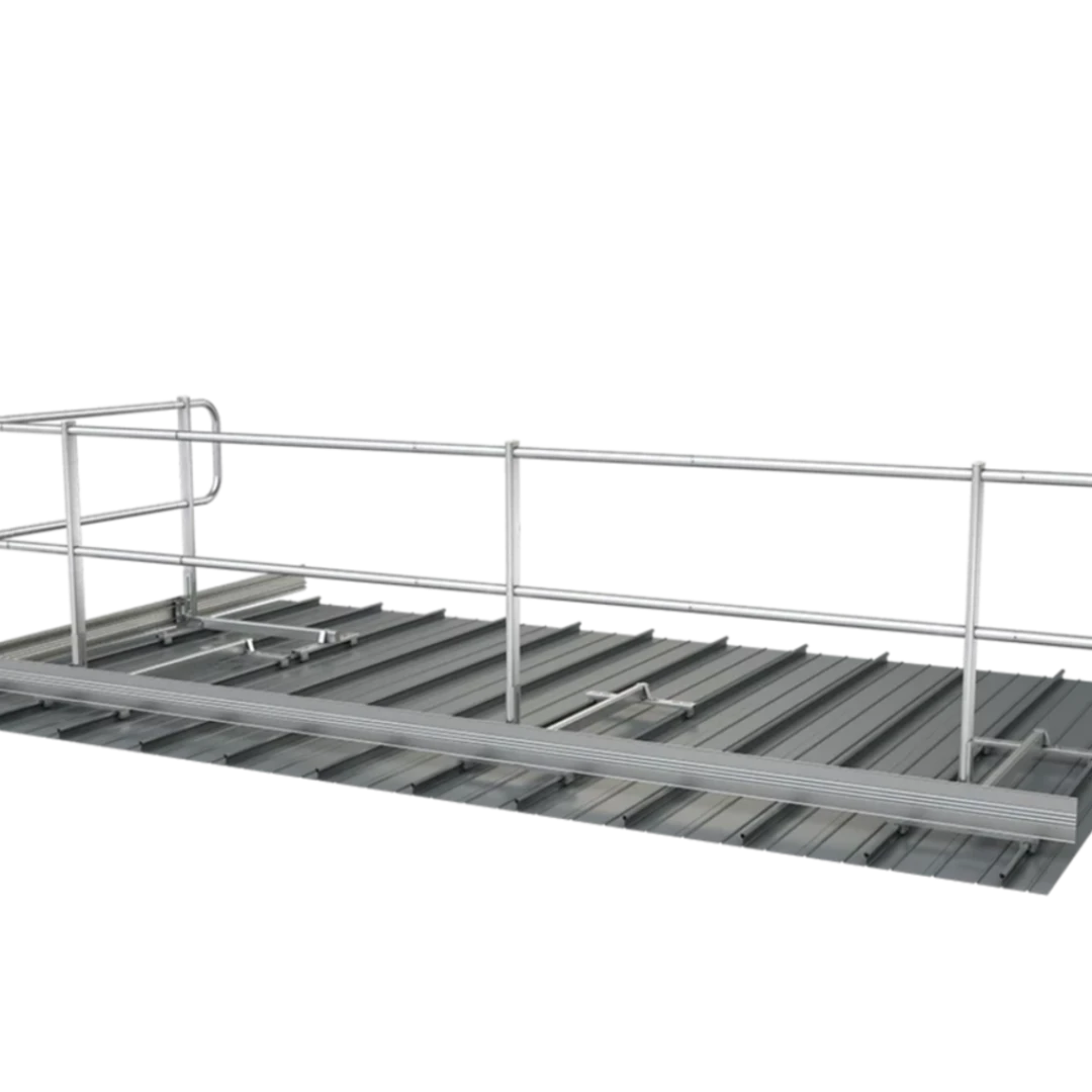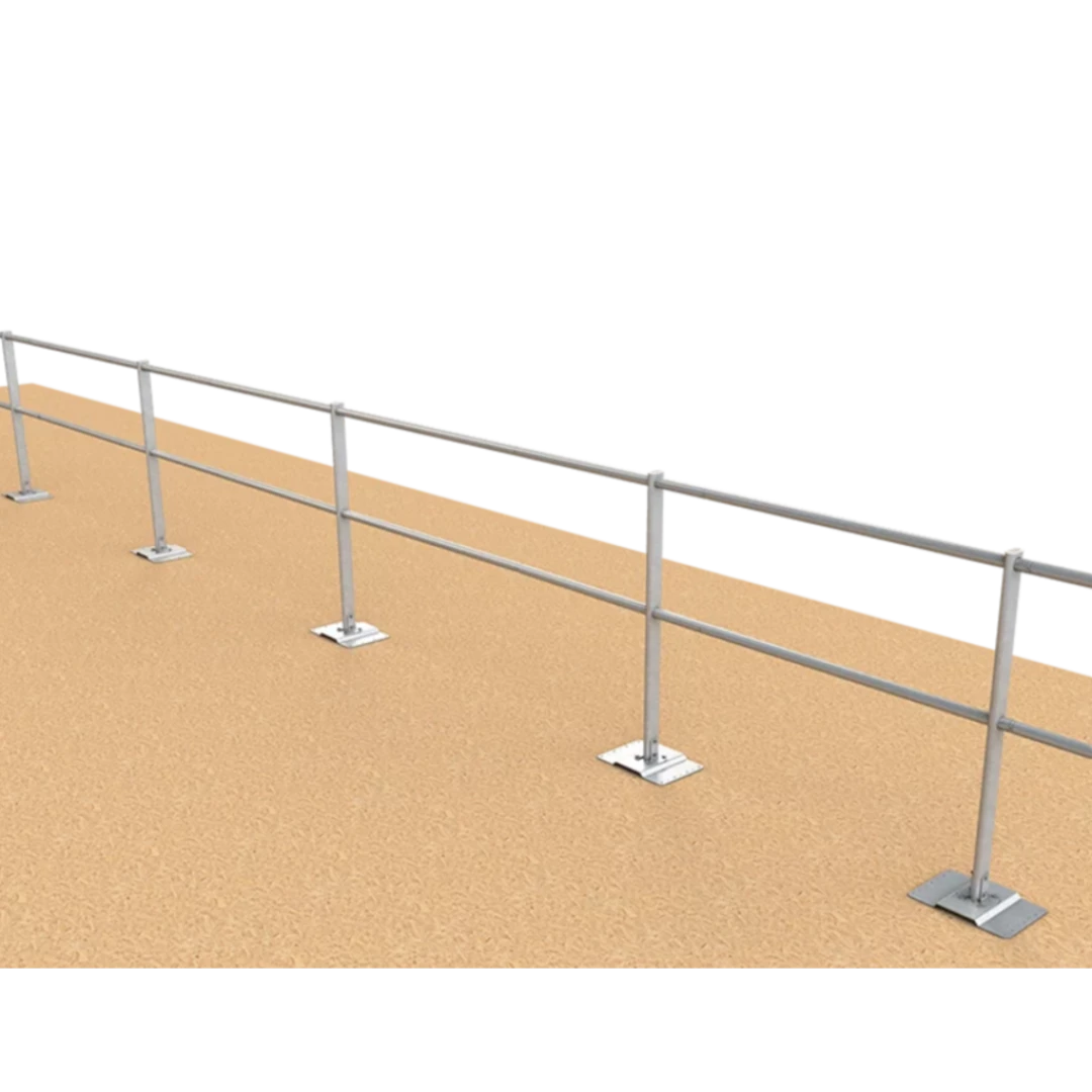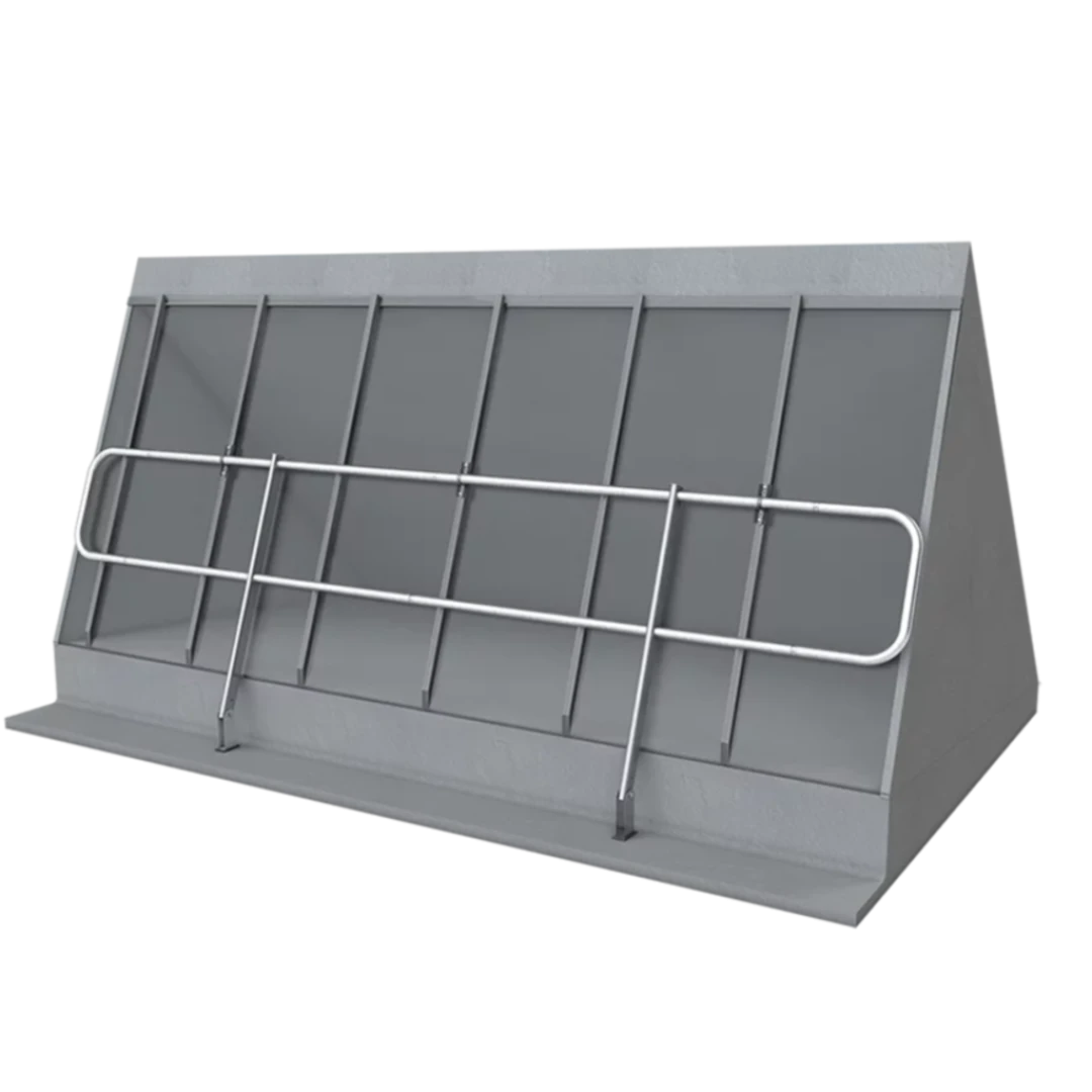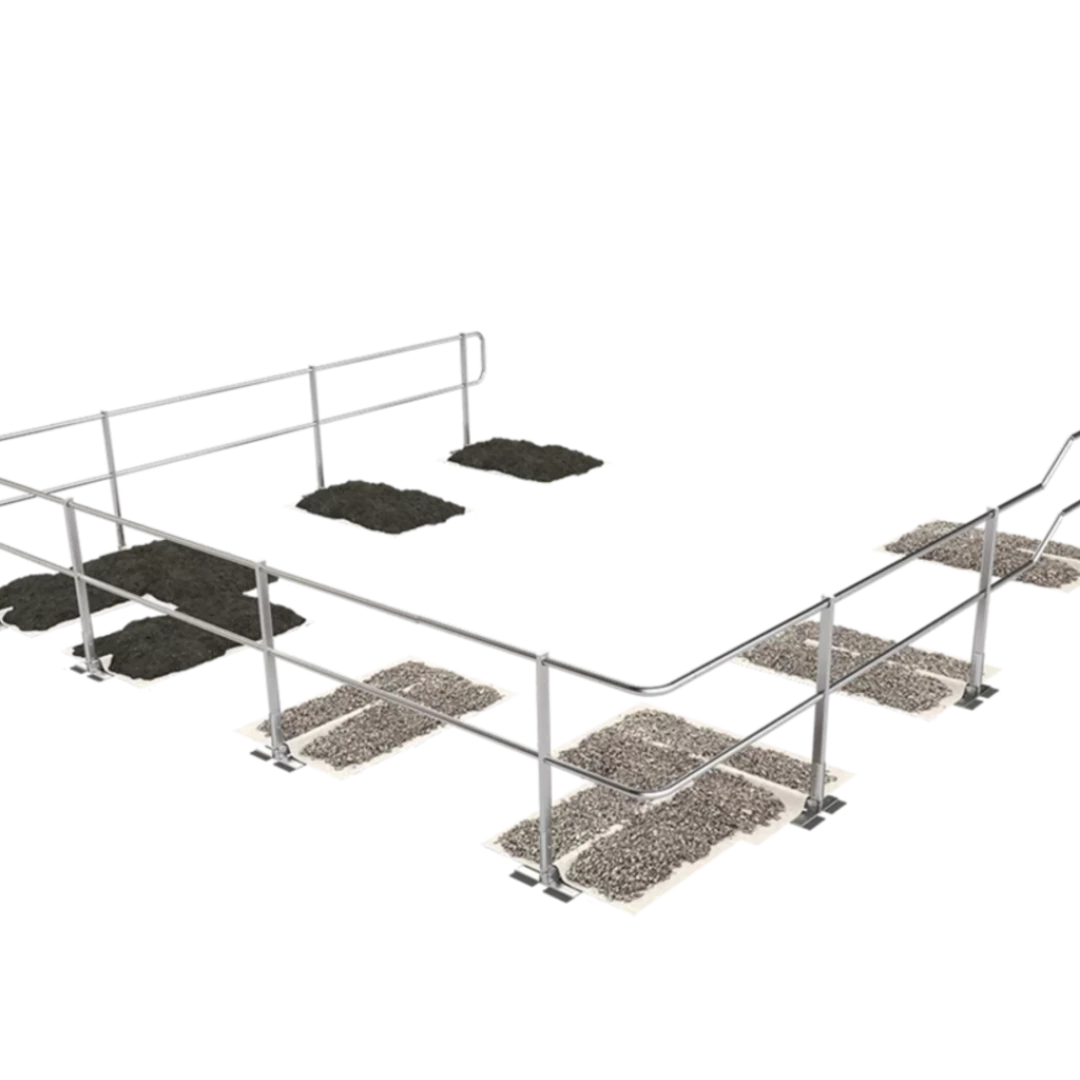 Dieses Geländersystem eignet sich zur kollektiven Flachdachsicherung bei Neigungen bis 10°. Es ist flexibel einsetzbar, witterungsbeständig und lässt sich einfach montieren. Damit können Dachkanten, Lichtkuppeln und andere absturzgefährdete Bereiche gesichert werden – ohne Dachdurchdringung. Der Seitenschutz ist 1.100 mm hoch und kann gerade oder um 15° geneigt aufgestellt werden. Optional ist eine Einbindung in Blitzschutzanlagen (100 kA) nach DIN EN 62305-3 möglich.