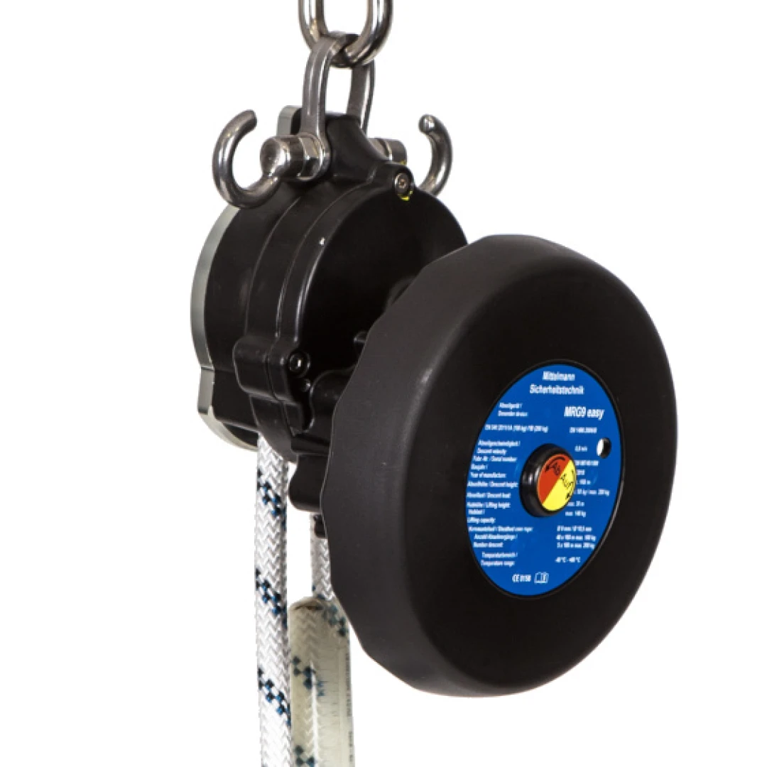 Das Mittelmann MRG9 easy ist ein handliches und kompaktes Abseilgerät mit Rettungshubfunktion. Es ermöglicht die sichere passive oder aktive Rettung von Personen, die in ein Auffangsystem gestürzt sind. Die verbaute Rücklaufsperre und die Fliehkraftbremse sorgen für eine sichere Bedienung auch in stressigen Situationen. Somit ist es optimal für den Einsatz im Baugewerbe und in der Industrie, wo eine Rettung nicht alltäglich ist.