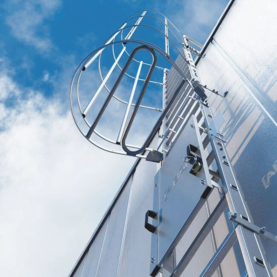 Die Käfigleiter ist eine Aluminiumleiter mit einer Breite von 650mm. Standardmäßig beginnt der Käfig bei 2,5 Metern (kann zwischen 2,2 und 3 Metern liegen). Dieser Käfig hat eine Tiefe von 800 mm, so dass er frei im Käfig klettern kann. Die Käfigleiter ist fest an der Fassade mittels Wandkonsolen befestigt oder mittels Betonblöcken frei aufgelegt.