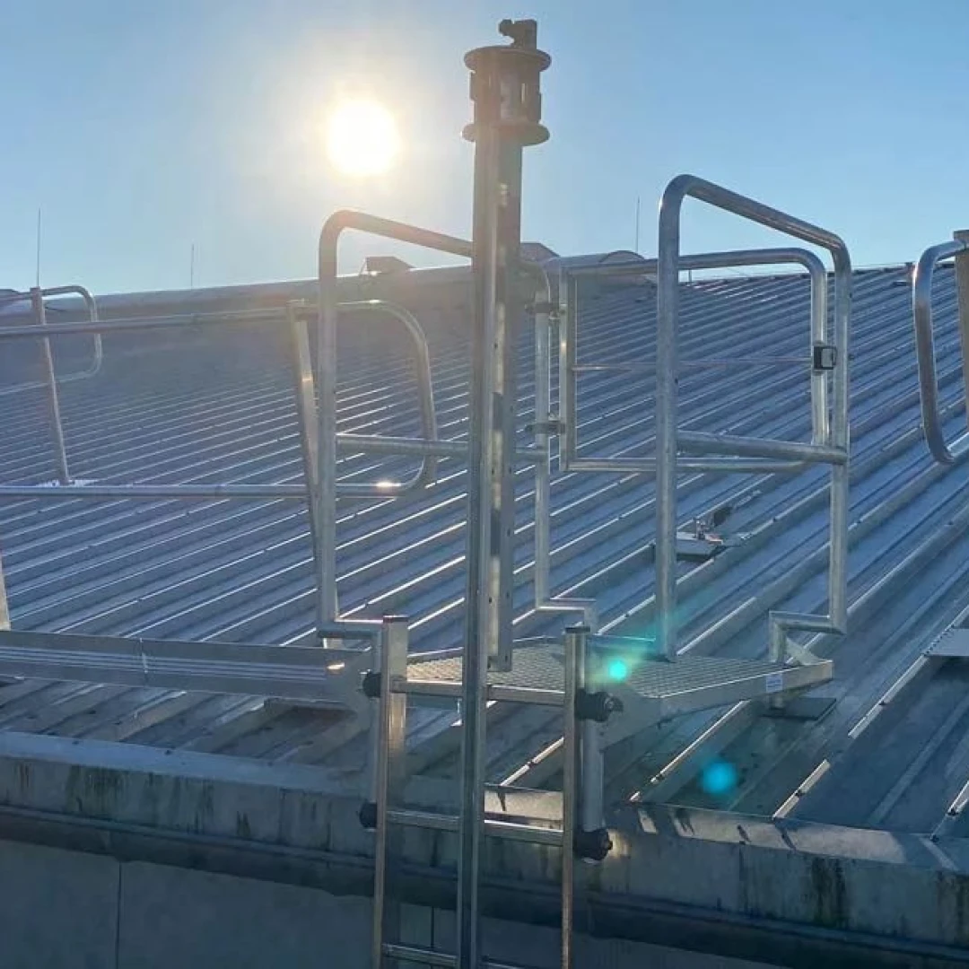 Um beim Klettern zusätzlichen Grip zu schaffen, sind die Sportarten in der Leiter mit einem Anti-Rutsch-Profil ausgestattet. Der letzte Schritt hat auch ein Zwiebelbrett von 200 mm, so dass das Dach sicher zugänglich ist, da es besser mit der Dachkante verbindet. Darüber hinaus fahren die Leiterbäume für 1,1 Meter weiter, wodurch es einfacher ist, aus und sicherer zu kommen. Auf Höhen von 10 Metern sollte es eine Rasttafel alle 6 Meter sein.