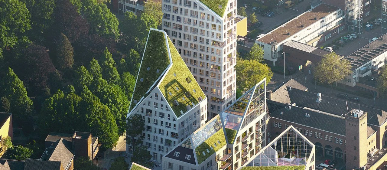 Het ontwerp van MVRDV en technische uitwerking door Inbo kenmerken zich door schuine daken met groen en zonnepanelen, wat zorgt voor een open, levendig en duurzaam karakter.