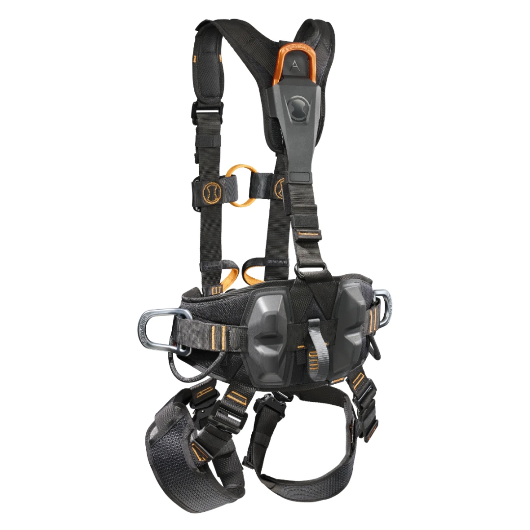 Ergonomisch valbeveiligings- en positioneringsharnas met twee keer gecertificeerd klim- en zitharnasbevestigingspunt en versterkte, slijtvast rugbescherming. Ontworpen voor werk op windturbines, masten en ladders.
